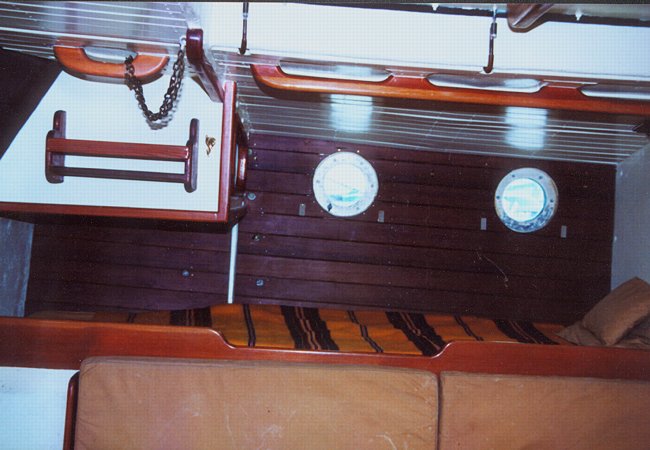 S/V Jocelyn: Starboard bunk, amidships. Interior ceiling: insulated painted wood siding: Redwood trim: varnished vertical grain Douglas Fir