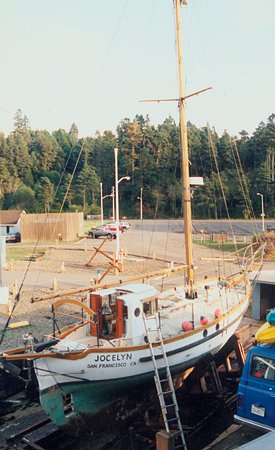 S/V Jocelyn: Hauled out at Noyo River, 1998.